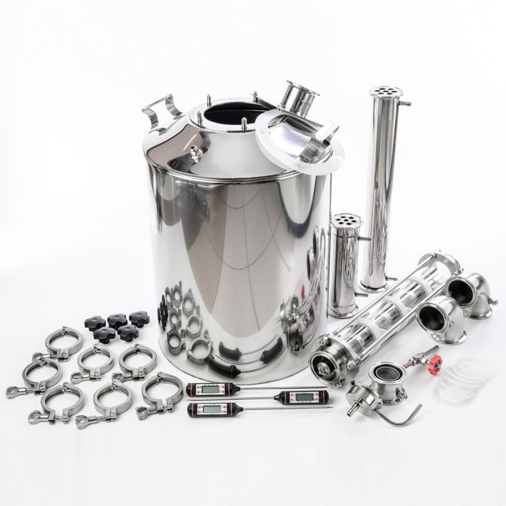 Distillation cube with a volume of 30 liters and a neck of 110 mm is convenient, easy to clean, you can order a pressure relief valve for it at a low price. All elements of the kit are connected with the help of clamps - today it is the most perfect solution, combining high assembly speed and tightness.